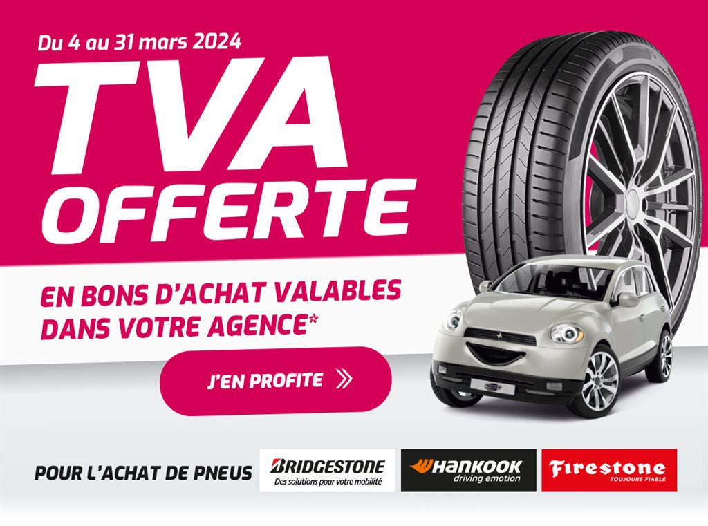 Si vous achetez et faites monter 2 ou 4 pneus été, hiver ou toutes saisons des marques BRIDGESTONE, HANKOOK ou FIRESTONE pour les véhicules de tourisme, camionnette ou 4x4 dans l'un des centres PROFIL PLUS participant à cette offre, vous recevrez un bon d'achat d'une valeur équivalente à la TVA, soit 16,67% du montant de vos achats.